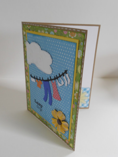 I used two different 6x6 pads from My Mind's Eye for the pattern papers on this card. The green one is from MME Happier 6x6 pad and the blue polka dot is from MME Everyday Flair 6x6 pad. I used Recollections kraft cardstock for the base and Recollection yellow cardstock for the smaller mat. The rest of the cuts I used all scraps from my scrap bin. The cloud was cut from cricut Summer Bliss seasonal cartridge and I ran it through my Cuddlebug with the Divine Swirls embossing folder. The clothesline is cut from cricut Country Life cartridge. I couldn't find a yellow flower, so I took a cream colored flower I had and sponged it yellow with CTMH Buttercup ink and added a brown brad I had to the center. The stamp Lazy days is from a K. Andrews Designs set called Splashtastic Summer.